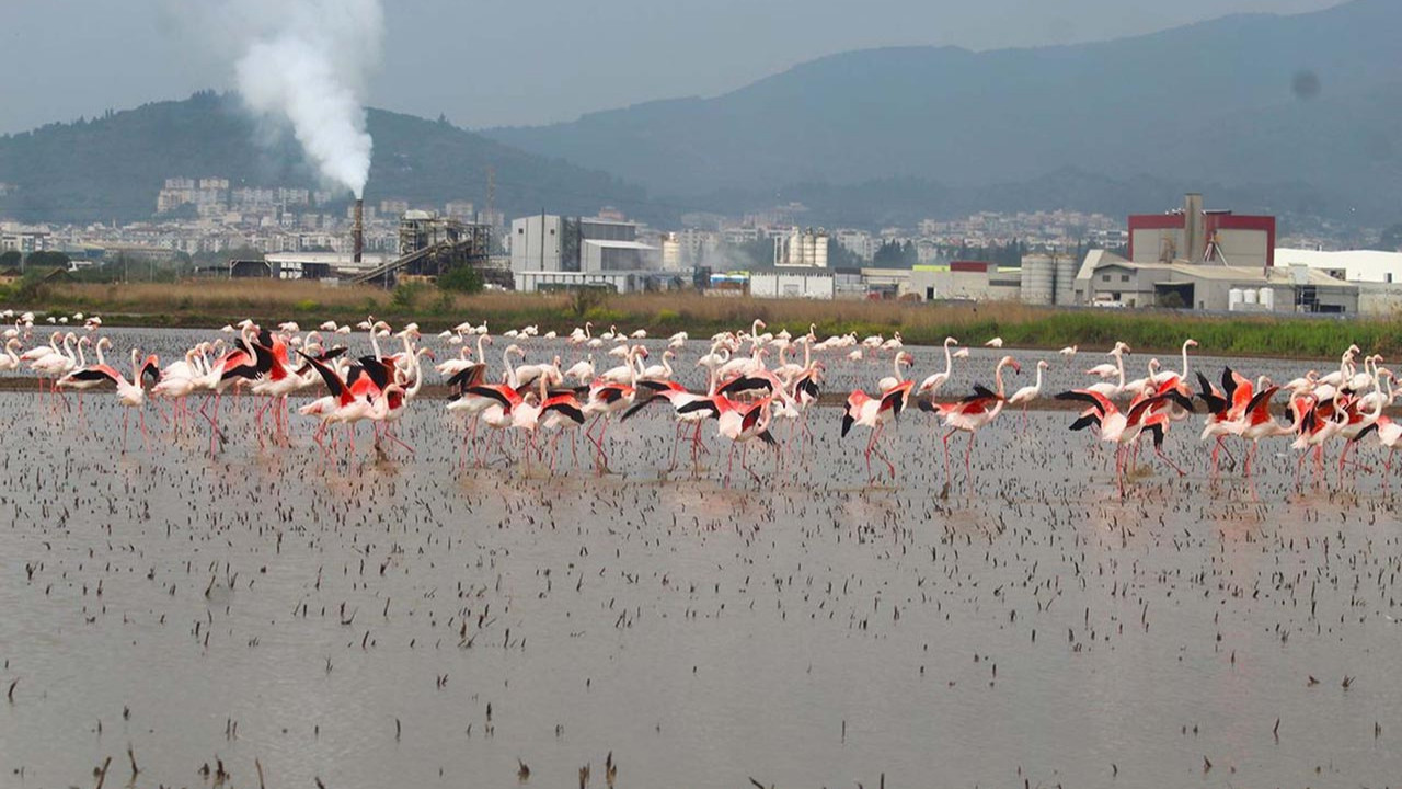 Birkaç günden bu yana bölgeye yağan yağmurlarla birlikte suyla dolan Söke Organize Sanayi Bölgesi'nin yanındaki tarlalarda yüzlerce flamingo konaklamaya başladı. Flamingolar görsel bir şölen oluşturdu.