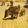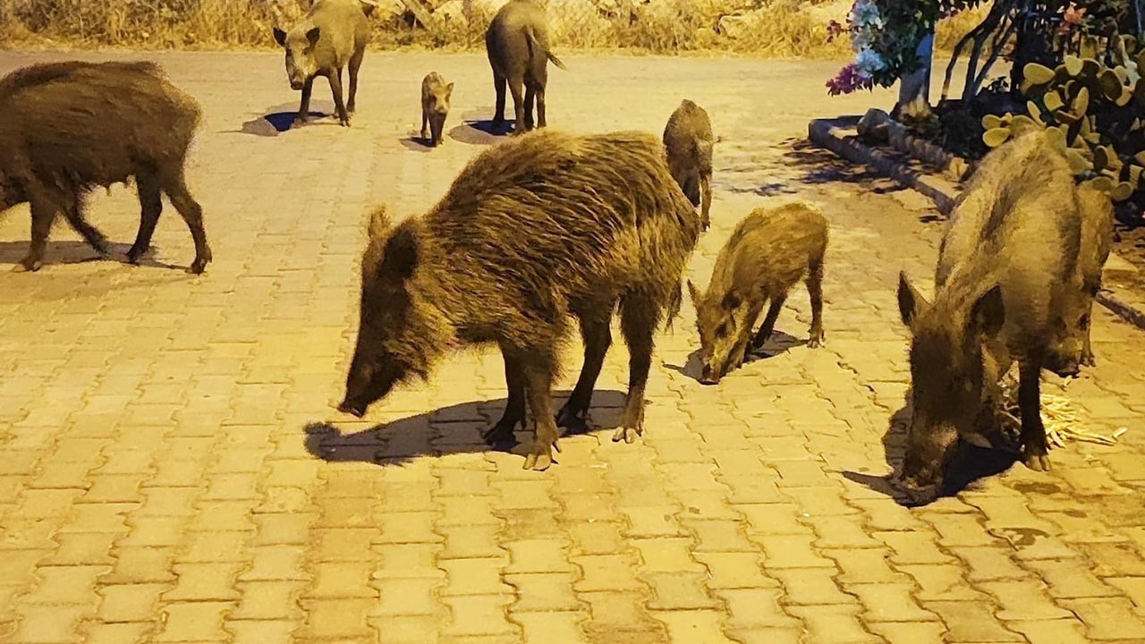 Türkiye'nin Ege'deki tatil cennetlerinden biri olan Aydın'ın Didim ilçesinde ormanda yiyecek bulamayan ve aç kalan yaban domuzları, şehre indi. O anlar, cep telefonu kamerasıyla kaydedildi.