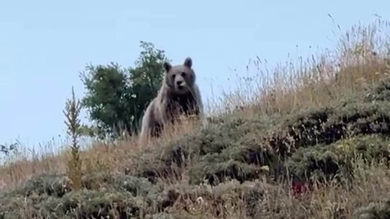 Erzurum'un Aziziye ilçesi Aşağı Akyazı köyünde hayvanlarını otlatan Soner Kaplan, bir anda ayı ile karşılaştı. Çoban, hayretinin ardından bir yandan elindeki cep telefonu ile ayıyı görüntülerken bir yandan da bağırarak onu korkutup kaçırmaya çalıştı. Ayı bir süre çobana baktıktan sonra kaçarak izini kaybettirdi.
