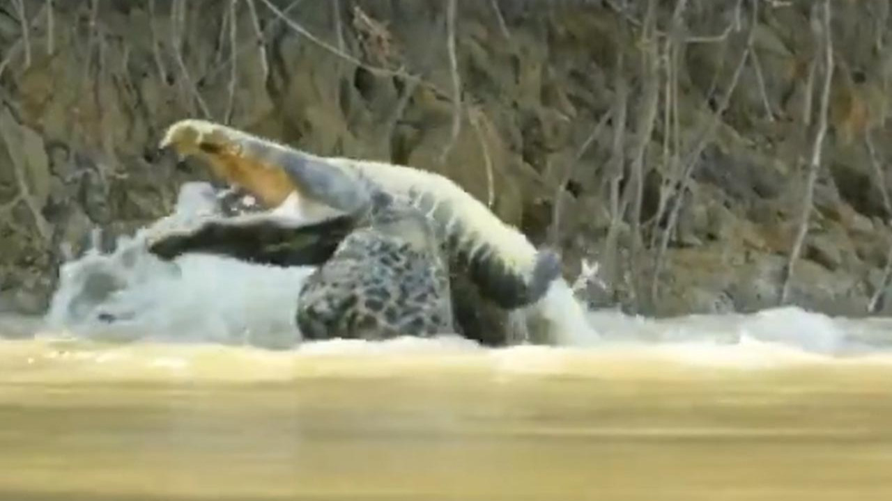 Vahşi doğanın iki acımasız avcısı timsah ve jaguarın karşı karşıya geldiği anlar saniye saniye kameraya yansıdı.