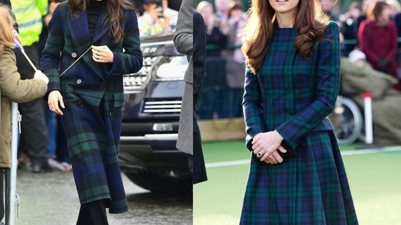 Meghan Marle, ilk resmi ziyaretini İskoçya'ya yaptığında lacivert-yeşil kareli kıyafeti tercih etti. Düşes Middleton aynı deseni 2012'de bir okul ziyaretinde giymişti..