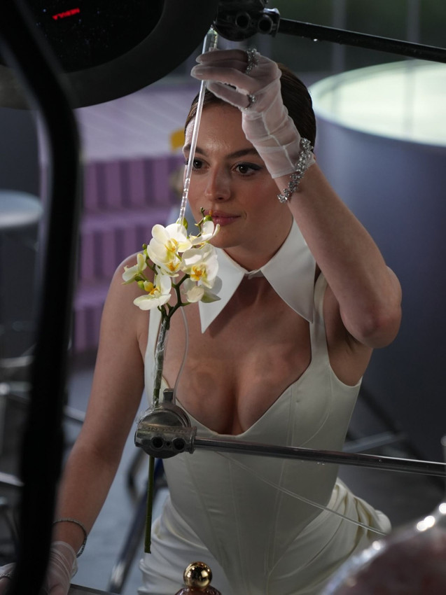 Cesur dekolteli kıyafetiyle adeta podyumdaki mankenleri aratmayan başarılı oyuncu, setten paylaştığı karelerle takipçilerinden tam not aldı.