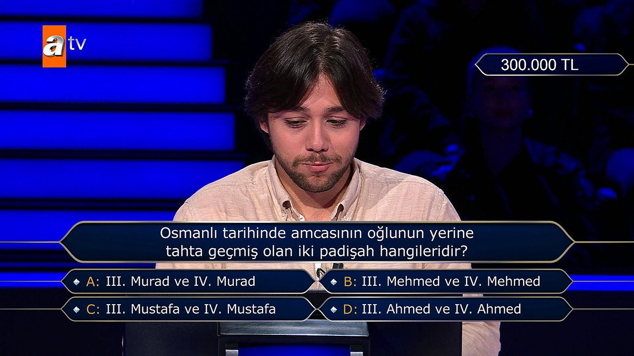 Sorunun doğru cevabı C) III. Mustafa ve IV. Mustafa olmasına rağmen, yarışmacı A şıkkı olan III. Murad ve IV. Murad cevabını verdi. Böylece 50 bin TL alarak elendi.