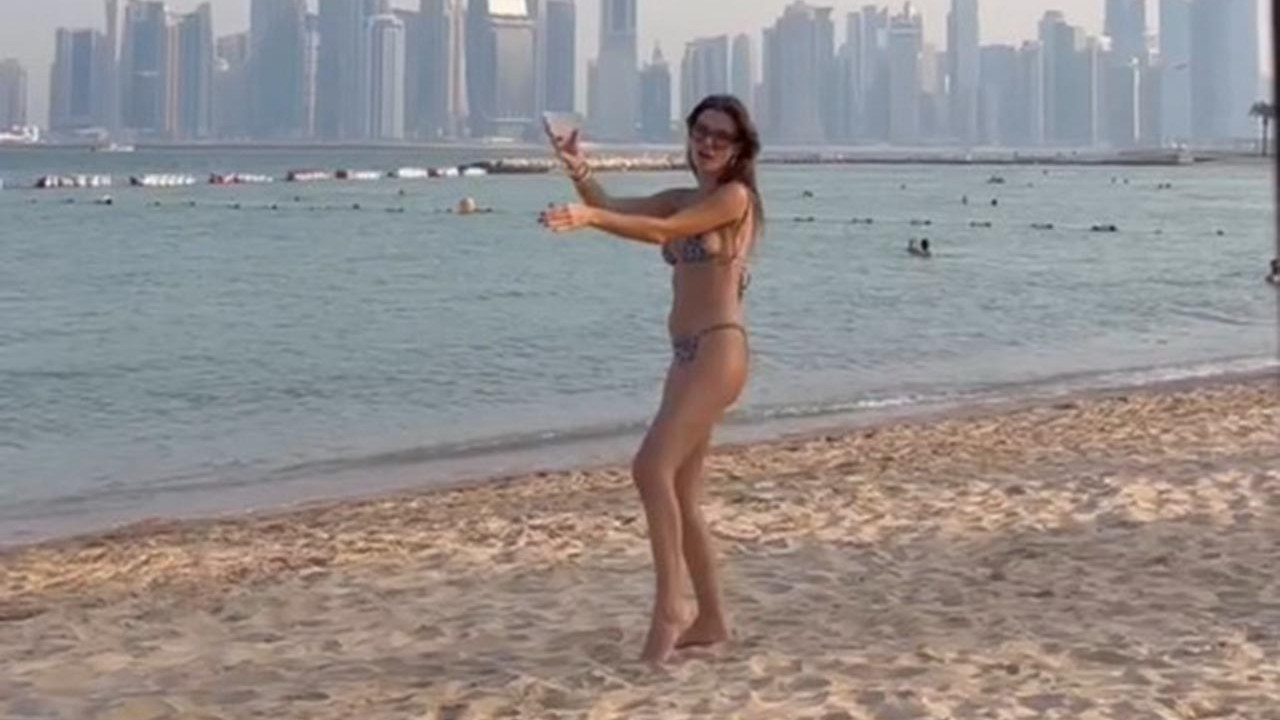 Gün batımında kızgın kumlarda bikinisiyle yaptığı dansı paylaşan Geyik'e hayranlarından beğeni yağdı.