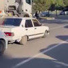 Diyarbakır’da bir kişi, yolda kalan Fiat Tofaş marka aracı, başka bir aracın kaputunun üzerine oturup ayakları ile ittirdi.