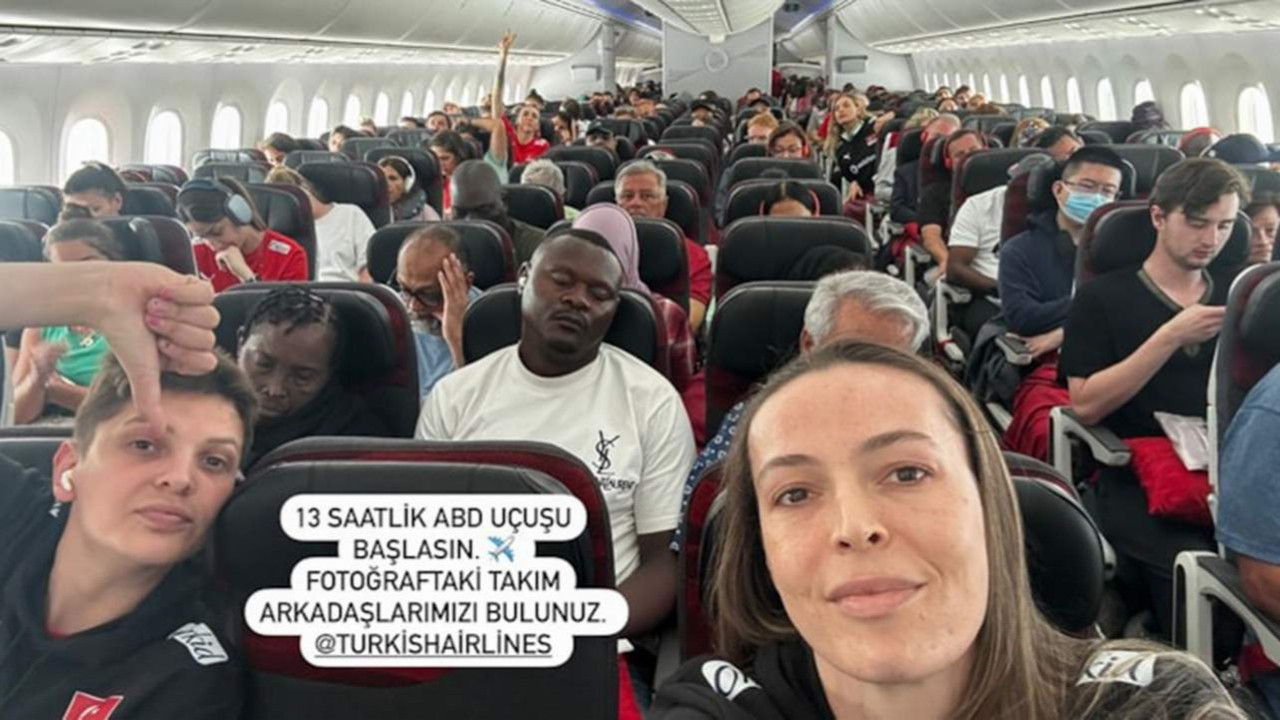 Kaptan Eda Erdem ise, "13 saatlik ABD uçuşu başlasın. Fotoğraftaki takım arkadaşlarımızı bulunuz" yazarak THY'yi etiketledi. Milli takım oyuncularının karışık düzende koltuklara oturduğu görüldü.