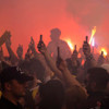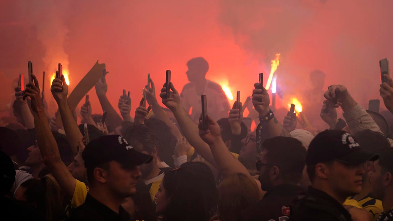Taraftarların tıklım tıklım doldurduğu caddede, meşaleler de yanarken marşlar ve besteler söylendi.