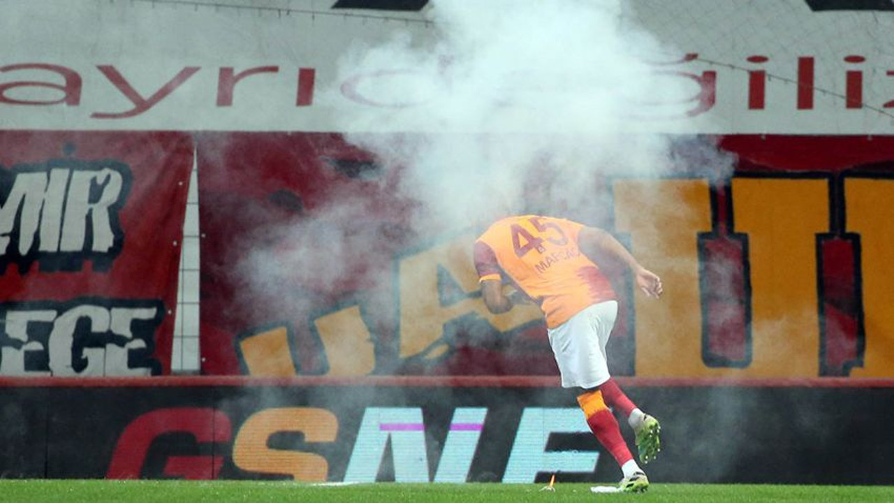 Türk Telekom Stadyumu'nda oynanan müsabakanın 7. dakikasında sarı-kırmızılıların hücum ettiği anda, dışarıdan sahaya işaret fişeği atıldı.