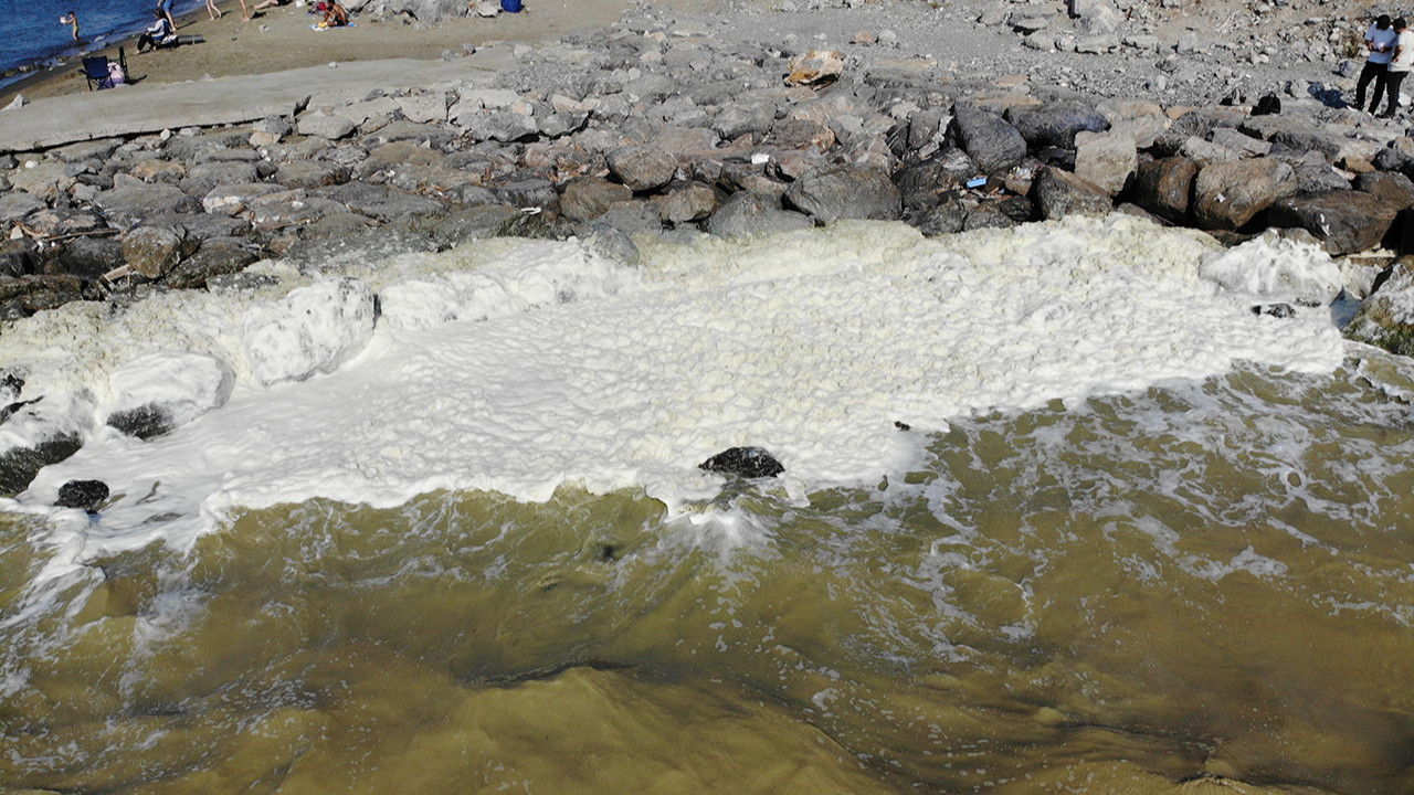 Akdeniz'de Hatay'ın Arsuz ilçesi sahilinde su yüzeyinde oluşan köpüksü beyaz tabaka vatandaşları endişelendirdi.