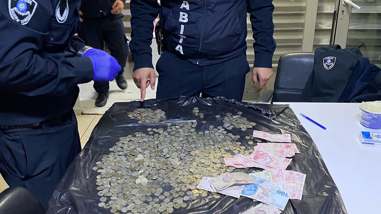 Antalya'da denetim yapan zabıta ekiplerinin üst geçitte yakaladığı dilencinin üzerinden Türk Lirası ile birlikte 15 farklı ülkenin para birimine ait madeni para çıktı.