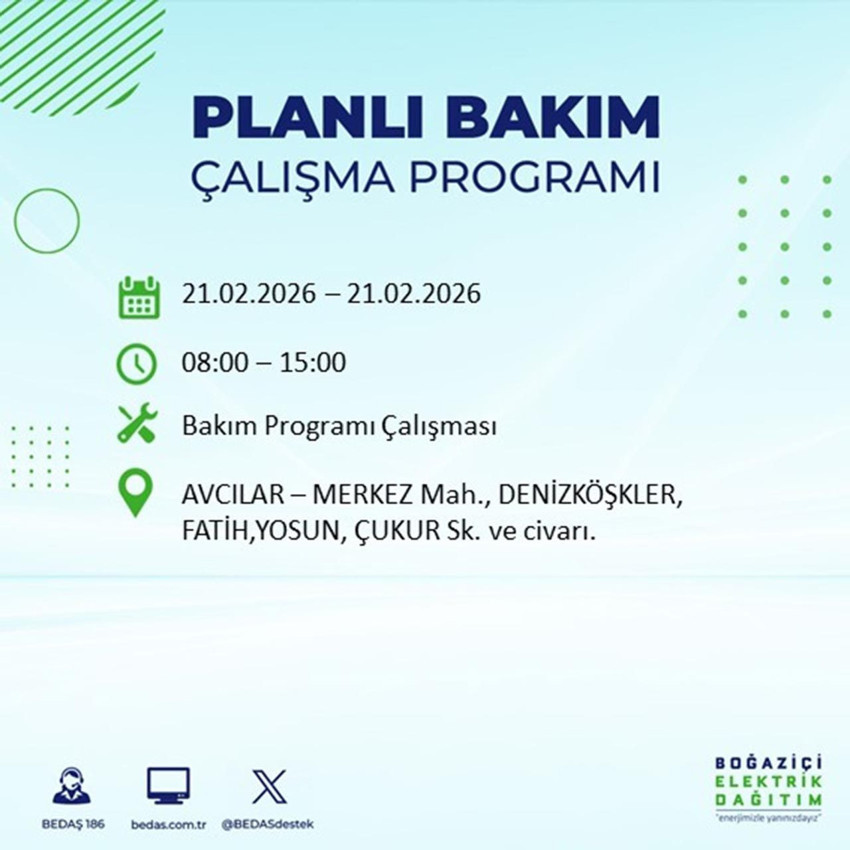İstanbul'da 21 Şubat Cumartesi ve 22 Şubat Pazar günü elektrik kesintisi yaşanacak. Boğaziçi Elektrik Dağıtım A.Ş. (BEDAŞ), planlı bakım ve yatırım çalışmaları nedeniyle 21 Şubat'ta 14 ilçede, 22 Şubat'ta ise 6 ilçede elekrik kesintisi yapılacağını açıkladı. Peki kesintiden hangi mahalleleler etkilenecek? Elektrikler ne zaman gelecek? İşte hafta sonu için elektrik kesintisi programı...