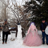 6 kişi, kardan gelin ve damat yaptıktan sonra müzik ve davul eşliğinde halay çekti.