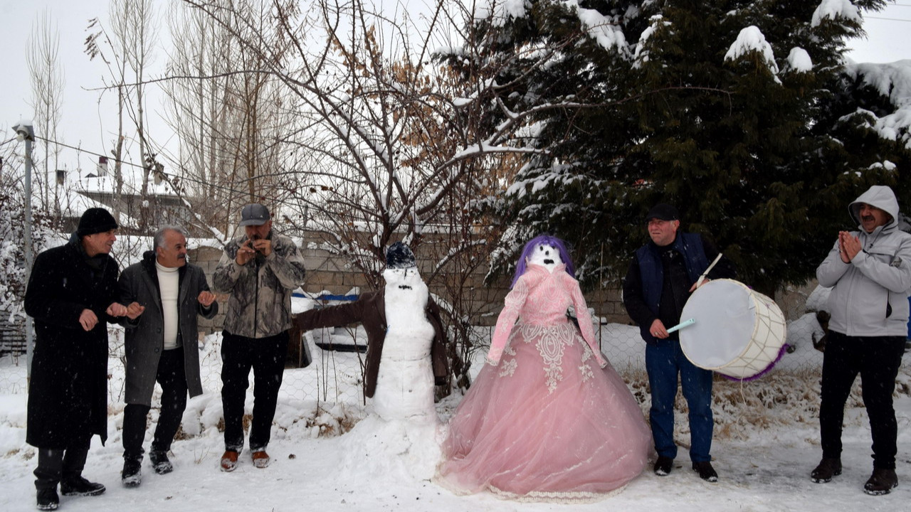Van'ın Erciş ilçesinde 6 kişi, yoğun kar yağışını kutlamak için kardan gelin ve damat yapıp, müzik ve davul eşliğinde halay çekti.