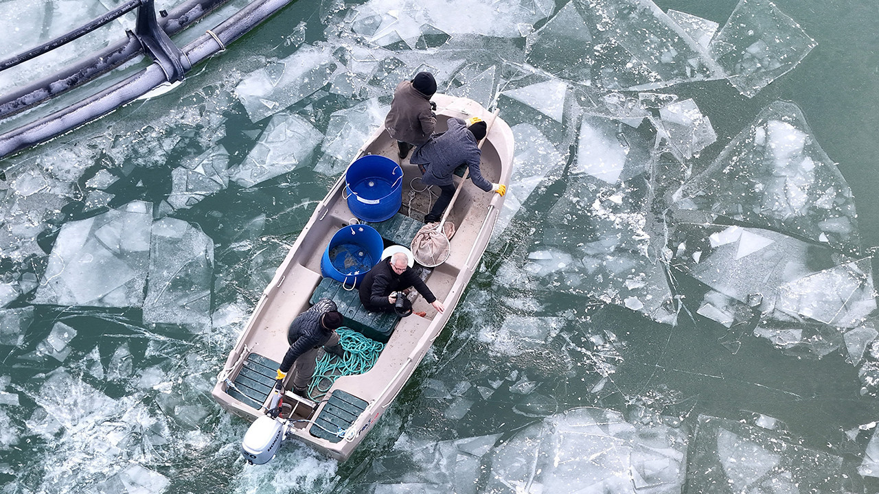 Barajda balıkçılık yapan vatandaşlar, buzları kırarak kafeslere ulaşmaya çalışıyor.