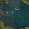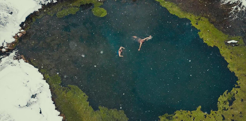 Karla kaplı arazinin ortasındaki gölde yüzen grup, o anları dronla kayda aldı. (DHA)