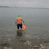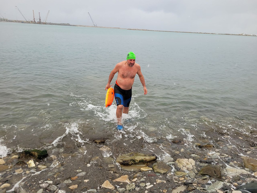 Hava sıcaklığının 1, deniz suyu sıcaklığının ise 6 derece olduğu havaya aldırış etmeyen Gürel, kalın kıyafetler giymiş arkadaşlarının gözü önünde önce karların üzerine uzandı, ardından denize girerek kulaç attı.