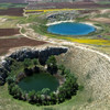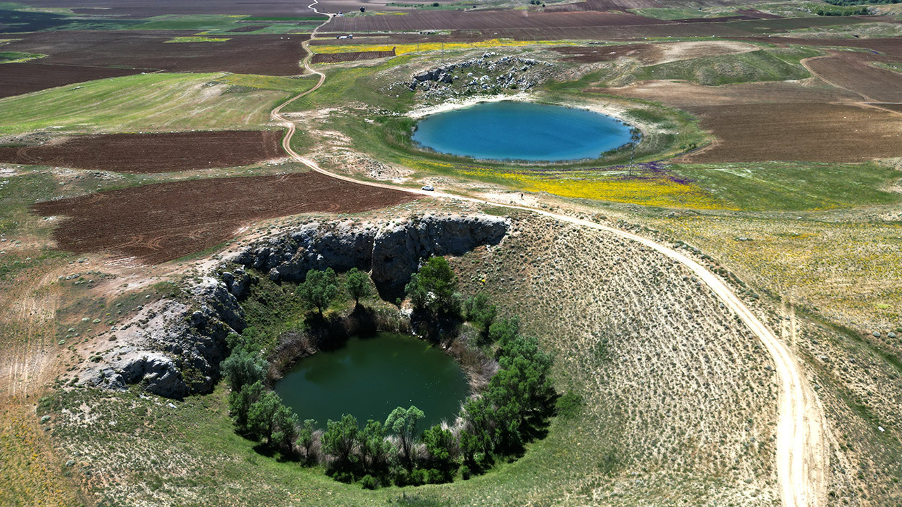 Sivas'ın Zara ilçesinde dipten kaynayan sularla oluşan ve bozkır ortasındaki nazar boncuğunu andıran Ağ Göl ve Kara Göl, bahar renkleriyle dikkat çekiyor.