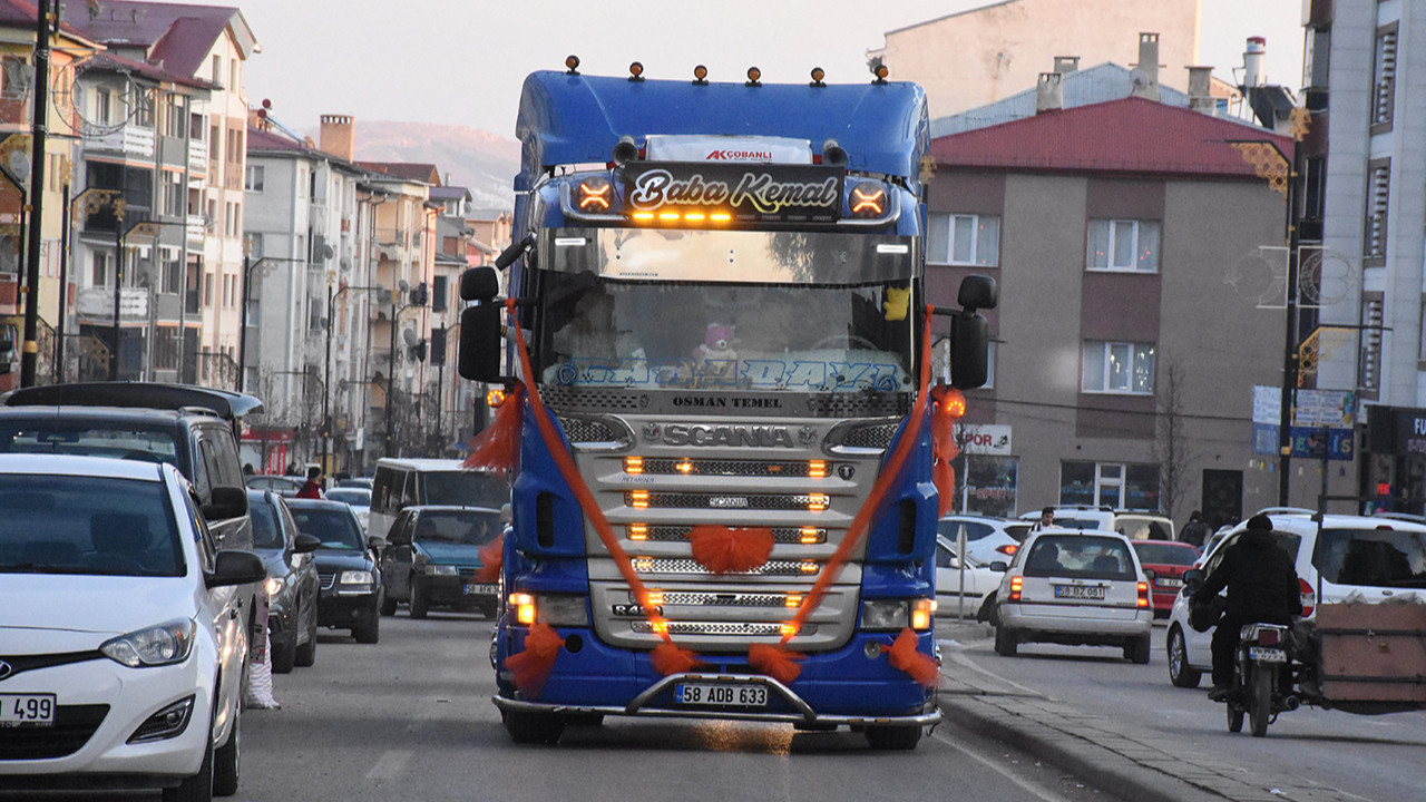Sivas'taki bir düğünde TIR şoförlüğü yapan damat kullandığı TIR'ı gelin arabası yapıpı kent sokaklarında şaşkın bakışların altında konvoy yapıp, tur da attı.