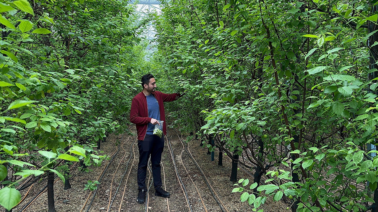 Bursa'nın İznik ilçesinde 26 yaşındaki ziraat mühendisi Mustafa Kutay Ası, içinde 300 adet erik ağacı bulanan 800 metrekarelik akıllı serasında kış ayında yeşil erik yetiştiriyor.