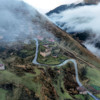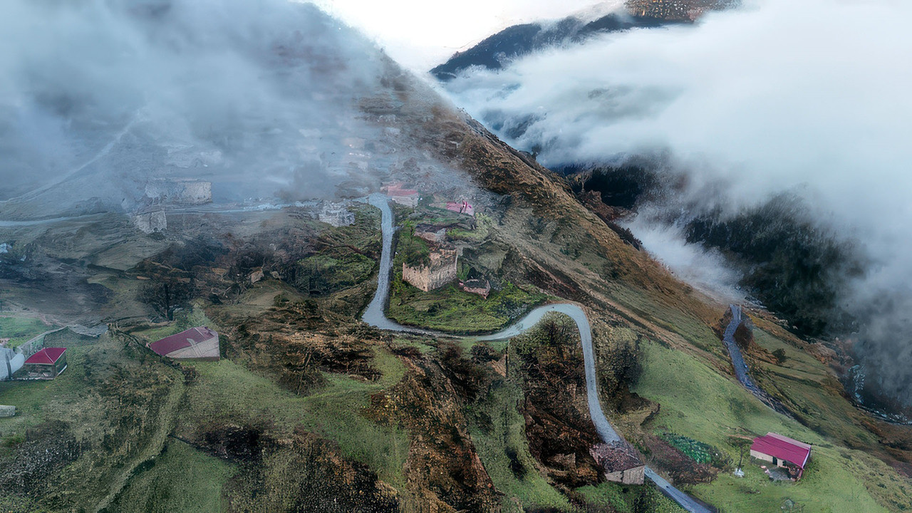 Gümüşhane'de yer alan, 17'nci yüzyılda Rum madenciler tarafından kurulduğu bilinip, tek katlı yapılar ve kiliselerden oluşan Santa Harabeleri, sonbahara sis ve bulutları arasında renk cümbüşüyle veda ediyor.