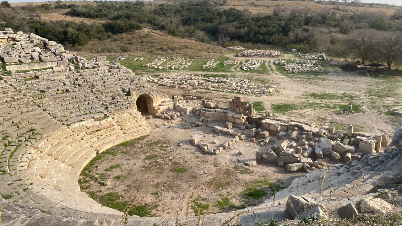 Bu yıl çalışmaların ağırlıklı olarak sütunlu cadde ve tiyatroda sürdürüldüğünü söyleyen Faris Demir, "Bu sezon biraz tiyatroya ağırlık verdik ve tiyatronun orkestra, sahne binası ve girişleri açığa çıkarıldı. Tiyatro, Roma İmparatorluğu Dönemi'ne ait, milattan sonra 1'inci yüzyılda inşa edilmiş olup, yaklaşık 5 bin kişi kapasiteye sahiptir. 2025 yılı çalışmalarından da yine tiyatroda sahne binasına ait mimari bloklar, adak yazıtları ve masklar ortaya çıkartılmıştır. Oldukça ilginç görünüme sahip mask kabartmalarında doğu ve batı kültürlerinin izlerini görmekteyiz. Ortaya çıkardığımız mimari parçalar ile sahne binasını yeniden ayağa kaldırılmamız mümkün olacaktır" diye konuştu.