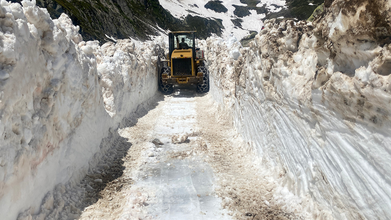 Ekipler, Ardeşen ilçesine bağlı deniz seviyesinden 2 bin 400 metre yükseklikteki Balıklı Yaylası’nda, çığın da etkisiyle kar kalınlığının yer yer 5 metreyi aştığı bölgelerde karı temizlemeye çalışıyor.