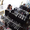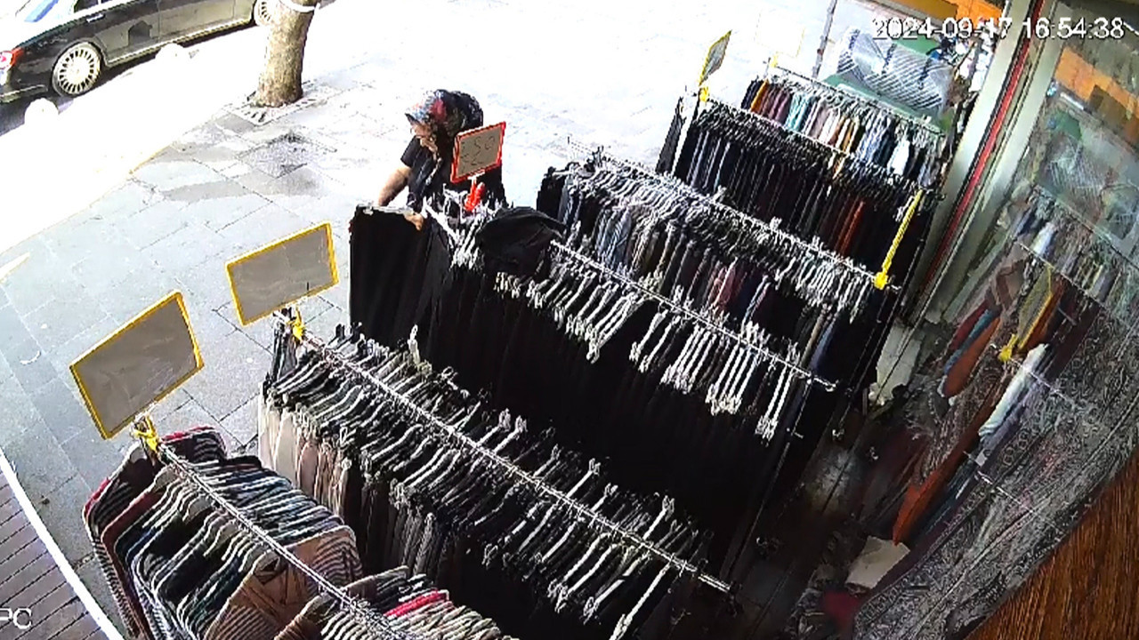 İstanbul'un Arnavutköy'de bir giyim mağazası önünde sergilenen elbiseleri seçerek beğenen kadın, ürünleri çantasına doldurarak çaldı. Hırsızlık anı güvenlik kamerası tarafından görüntülendi.