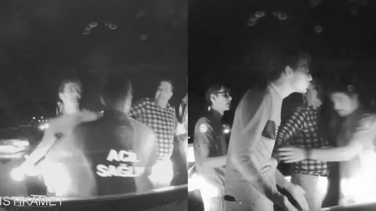 Ambulansın araç içi kamerasına yansıyan görüntülere göre ambulansın arkasında hasta olup olmadığını kontrol eden baba ve oğulları, o anları cep telefonu kamerasıyla da kayıt altına alırken, ambulansın sürücü tarafına geçen baba S.Y.'nin, sürücü Karasulu’nun boğazını sıktı. Yaşananlara tepki gösteren kadın sağlık görevlisinin üstüne yürüyen Melih Y.’nin, kendisini engellemek isteyen Muhammed Ali Karasulu’ya ardı ardına yumruk attığı anlar da görüntüye yansıdı. Bir süre daha sağlık görevlileriyle tartışan baba ile oğulları otomobillerine binerek uzaklaştı.