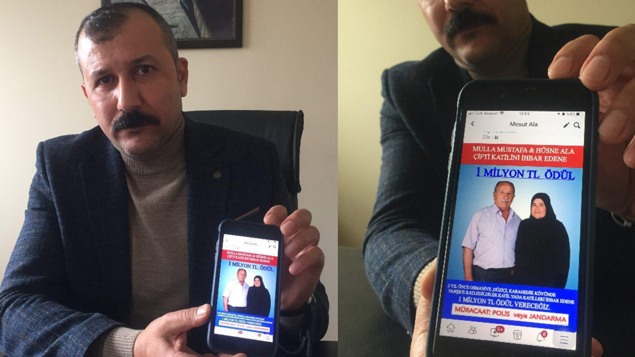 Ala, katillerin yerini ihbar edenlere 1 milyon lira ödül vereceğini ifade ederek, “Bu kesinlikle şaka değil, katil ya da katilleri gören, duyan ve bilen kim varsa hiç çekinmeden polis ya da jandarmaya giderek ihbarda bulunsun. İhbarı gerçekleştiren kişiye kolluk kuvvetleri önünde parasını vereceğim. Para konusunda hiç şüpheye düşmesinler, şaka olarak söylemiyoruz, kesinlikle ciddiyiz. Gelip 1 milyon lirasını alsın. Kesinlikle gören ya da duyan vardır ama ihbar etmeye korkuyordur. Ben şuna inanıyorum hiçbir cinayet kusursuz değildir. Bunda da bir hataları vardır ama biz göremiyoruz. Para kıymetli, belki ihbarcı şahısları cezbeder diye düşündüm. Gönül ister ki daha fazla vereyim, çünkü annem ile babamı maddiyatla asla ölçemem” dedi.