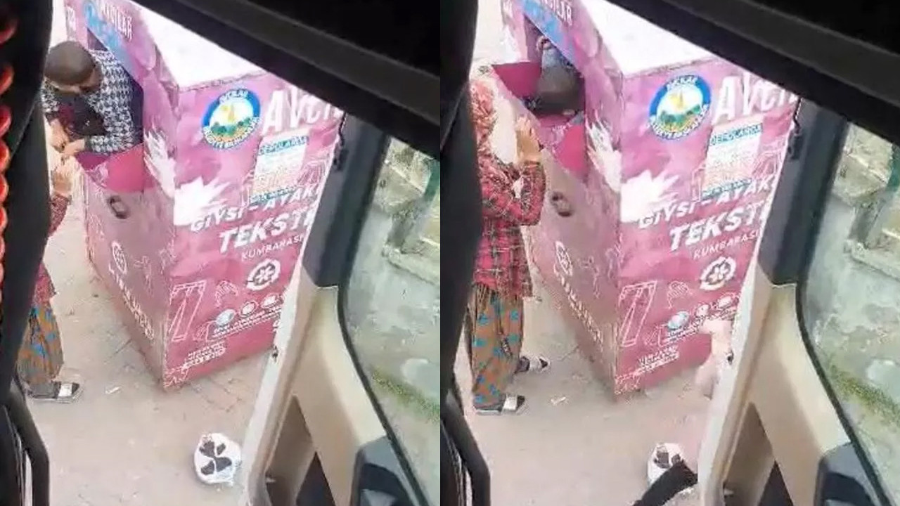 İstanbul Avcılar Mustafa Kemal Paşa Mahallesi'ndeki merkezi noktaya yerleştirilen kullanılmış kıyafet, ayakkabı ve teksil ürünlerinin bulunduğu geri dönüşüm kumbarasının yanına gelen bir kadın kapağı açarak 4-5 yaşlarındaki oğlunu içine soktu. Çocuk kumbaranın içerisindeki kıyafet ve dolu poşetleri tek tek kumbaranın haznesine bırakırken annesi de bunları alarak yere bıraktı.