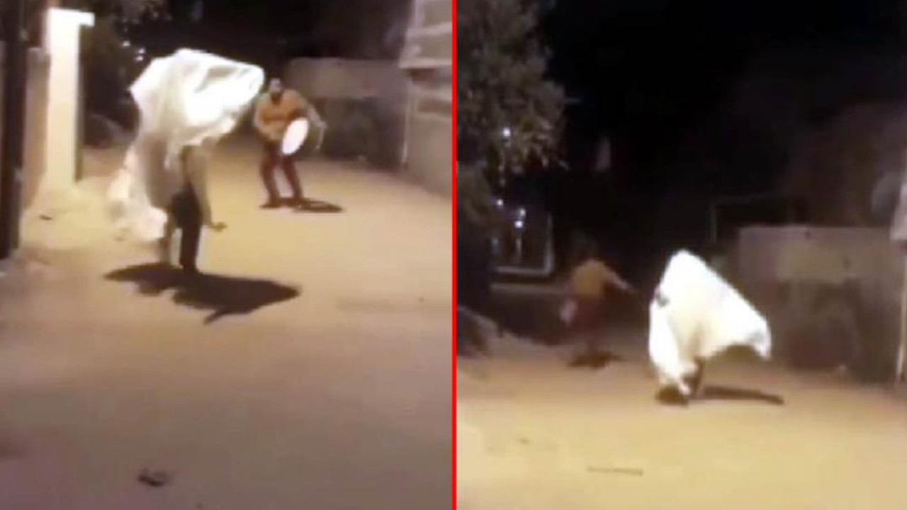 Üzerine beyaz çarşaf geçiren B.S., gece saatlerinde sokaklarda gezmeye başladı. B.S.'nin 'Hayalet' gibi sokaklarda gezmesi bazı vatandaşlar tarafından cep telefonuyla görüntülenirken, o anlar sosyal medyada çok sayıda kişi tarafından paylaşıldı. Görüntülerde duvarın arkasında saklanan B.S., ramazan davulcusu sokağa girince karşısına çıktı. Bir anda karşısına çıkan görüntüyle şaşkına dönen davulcu, elindeki davulu atarak kaçtı.