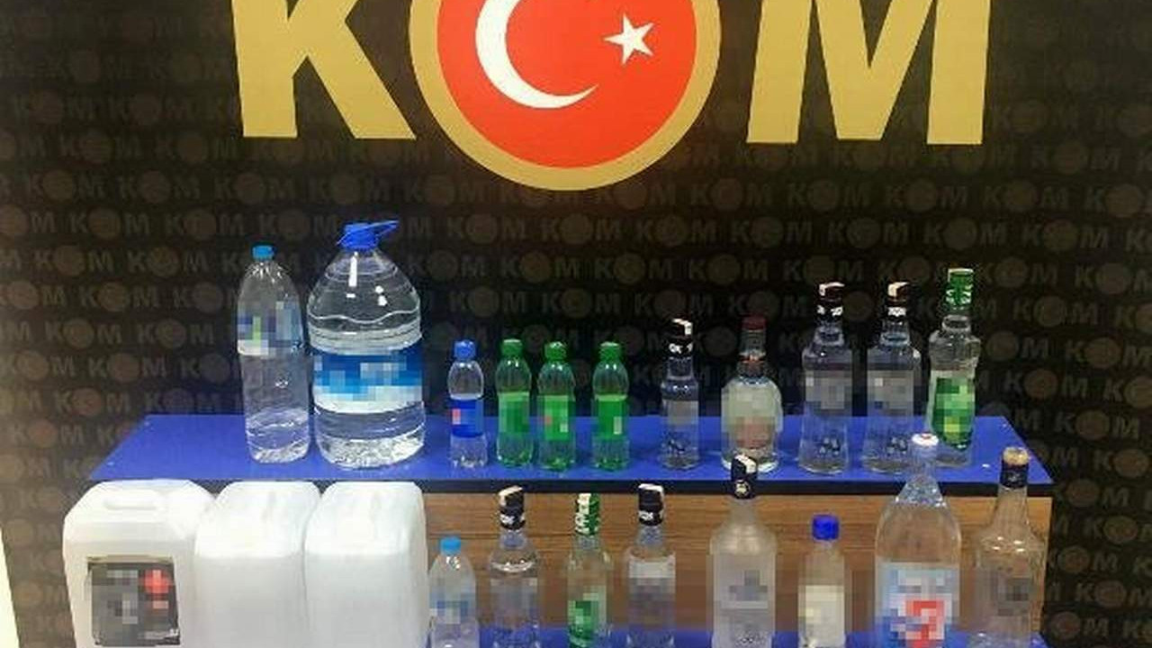 Aramada 30 şişe sahte içki, 15 litre etil alkol, çok sayıda boş içki şişesi ve şişelerde kullanılmak üzere çıkarılmış kapak bilyeleri ele geçirildi.