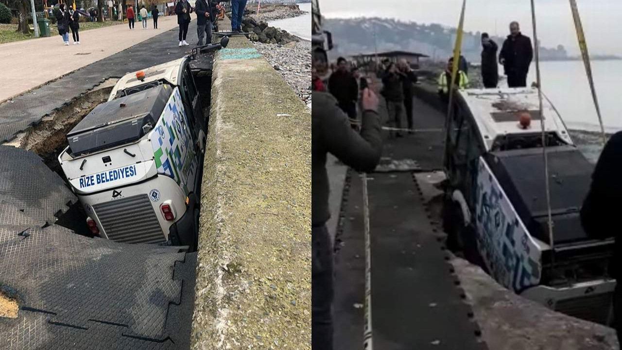 Olay merkez Ekrem Orhon mahallesi, sahil mevkii yürüyüş bandında meydana geldi. Rize Belediyesi'ne ait süpürme aracı yürüyüş bandını süpürdüğü sırada zeminde çöküntü oluştu. Oluşan çöküntünün ardından temizlik aracı olduğu yerde zeminin içerisine girdi. Altı dolgu olan sahilde oluşan göçüğe düşen aracın şoförü ise araçtan camı kırarak çıkabildi. Göçüğün oluştuğu bölgede önce sahil esnafı daha sonra güvenlik güçleri tarafından güvenlik şeridi çekilerek vatandaşlar uzaklaştırıldı. Sürücünün yara almadığı kazada olay yerine vinç çağırıldı. Vinçe paletler vasıtasıyla bağlanan süpürme aracı düştüğü yerden çıkartıldı.