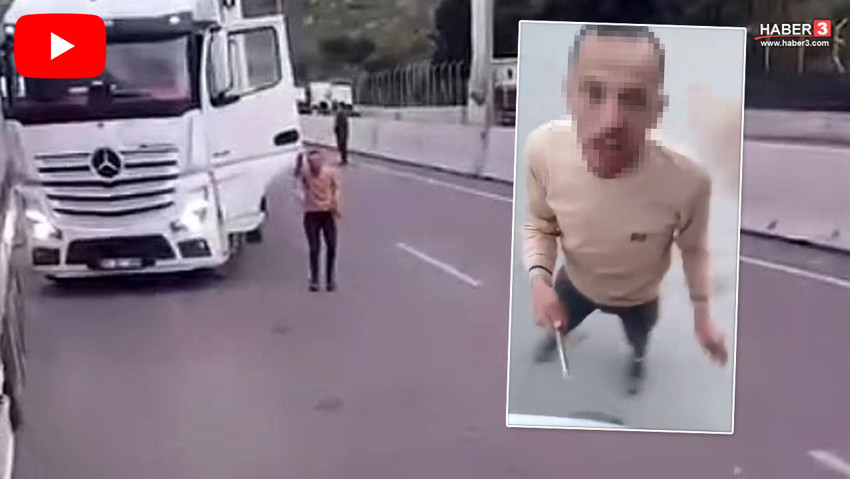 Görüntülerde, kızgın tır sürücüsünün aracından inerek meslektaşına demir sopayla saldırdığı, araca zarar verdiği ve küfür ile hakaret ettiği görüldü.