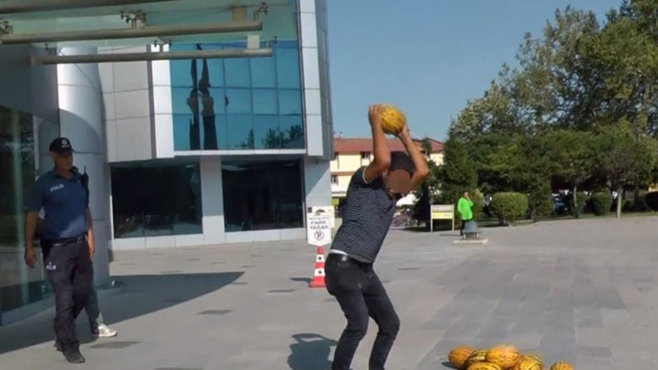 Açıklamalarının ardından, zabıtalara kavunlarının nerede olduğunu soran ancak yine yanıt alamayan A.K., öfkelenerek yanında getirdiği kavunları belediye binası önünde kırmaya başladı. Bunun üzerine çevrede güvenlik önlemi alan polis ve zabıta ekipleri, A.K.’yu gözaltına aldı. Zabıta ekipleri o anları kayda almaya çalışan basın mensuplarına da engel olmaya çalıştı. Belediye önünde yaptığı eylemin ardından gözaltına alınan A.K., serbest bırakıldı.
