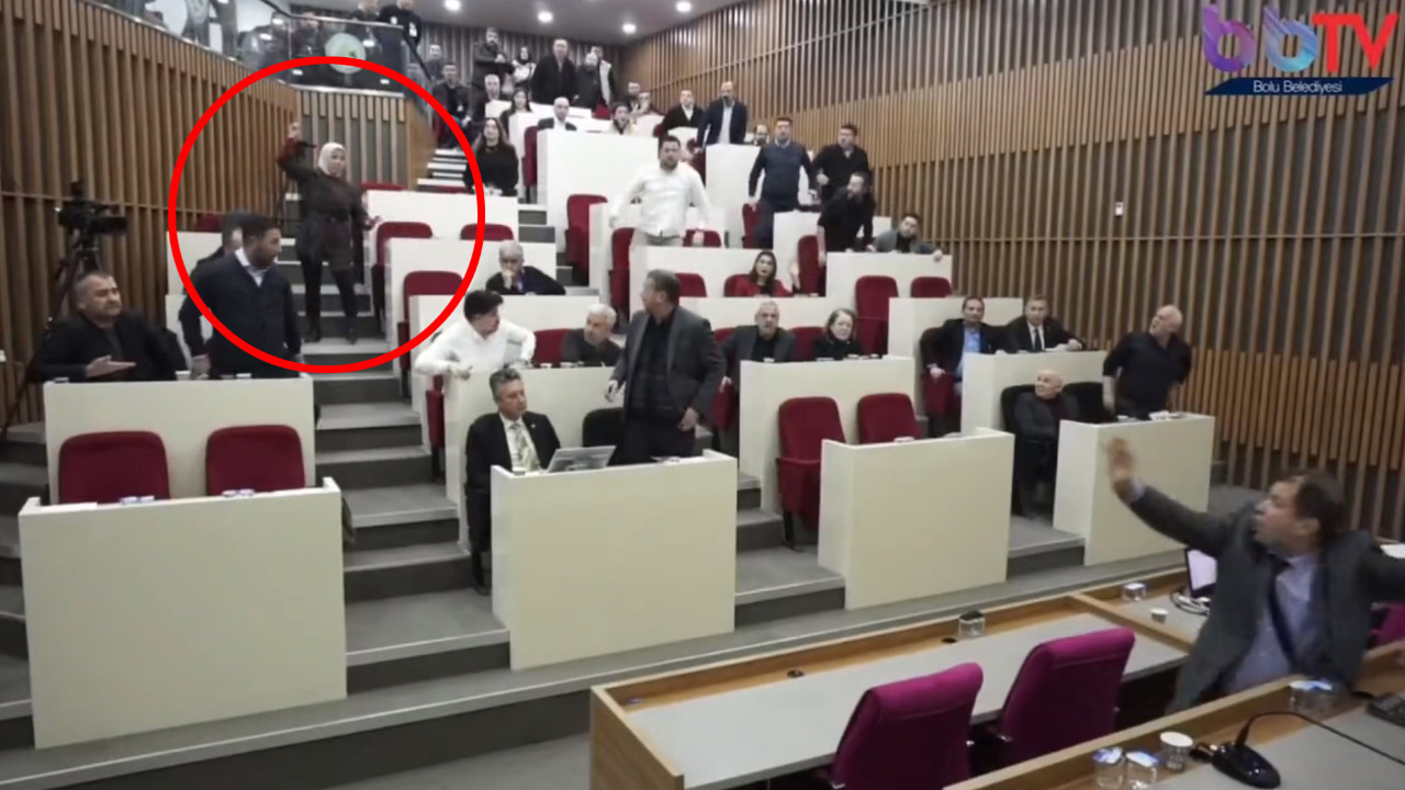 Abone OlBolu Belediyesi'nin meclis toplantısında, AK Partili Meclis Üyesi Hacer Çınar Bolu Belediye Başkanı Tanju Özcan'a su şişeleri fırlattı.