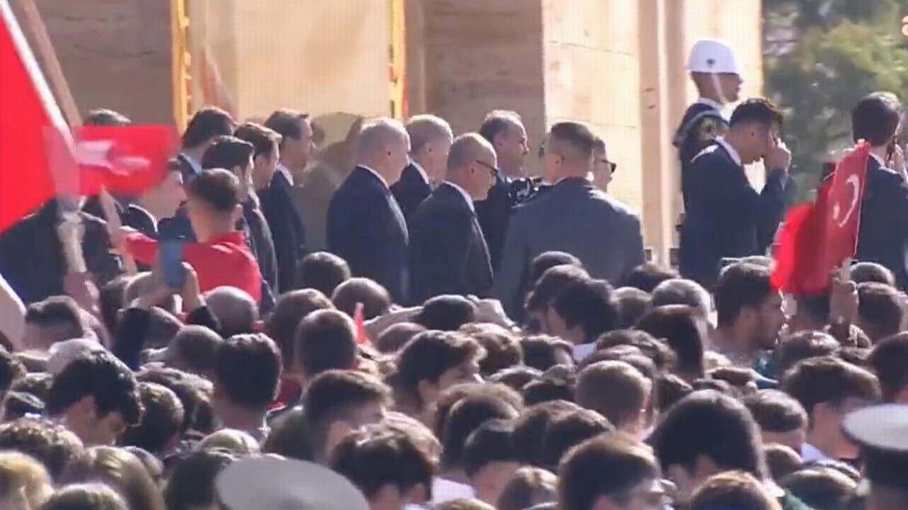 Türkiye Cumhuriyeti’nin 100.kuruluş yıldönümünde Cumhurbaşkanı Erdoğan ve devlet erkanı Anıtkabir’deki törenlere katıldılar. Erdoğan ve devlet erkanı Aslanlı Yol’dan yürüyerek Atatürk’ün mozolesine geldi. Cumhurbaşkanı, Atatürk’ün mozolesine kırmızı ve beyaz karanfillerle süslü çelengi bıraktı. Devlet erkanı önce saygı duruşunda bulundu ardından İstiklal Marşı okudu.