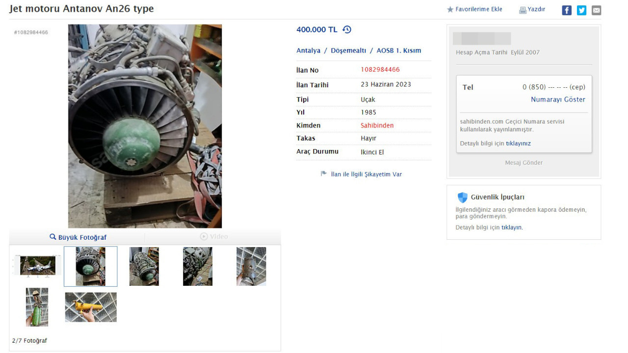 Ukrayna envanterinde bulunan AN-26 tipi nakliye uçağının 1985 yapım motorunu, Antalya'da bir vatandaş tarafından 400 bin TL'ye satışa çıkardı.