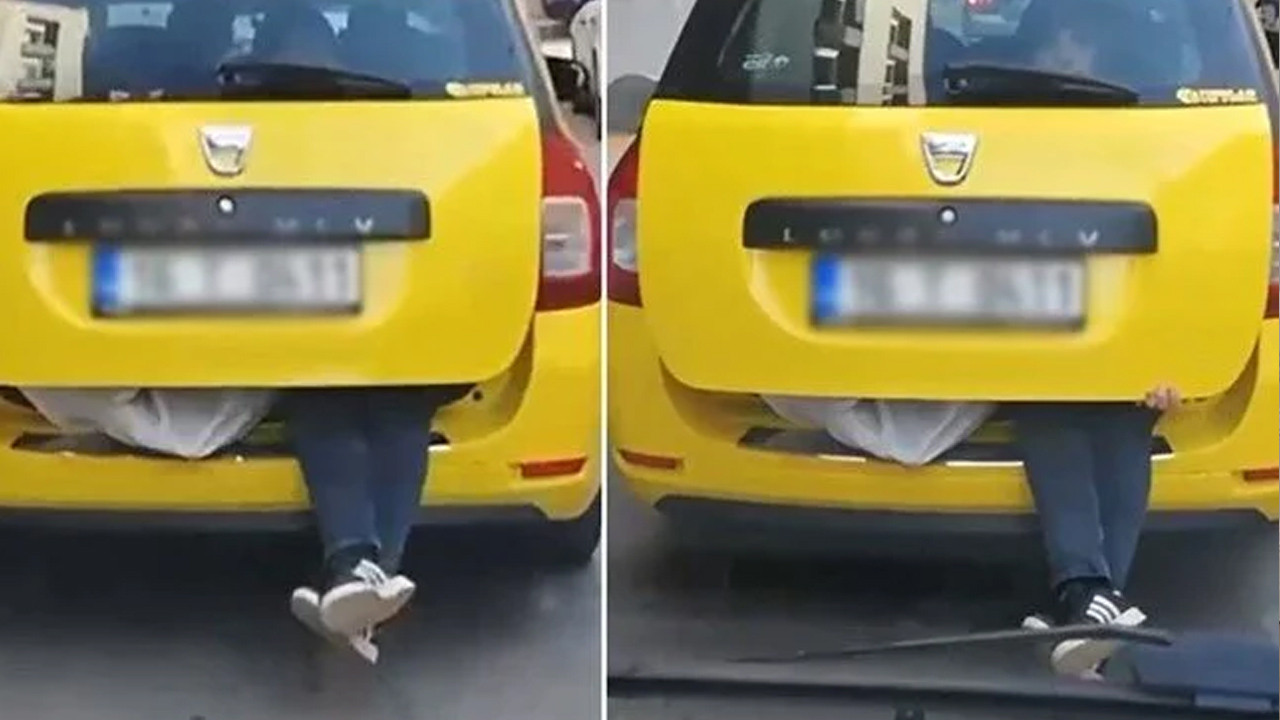 Arkadaşları ile bindiği taksiye eşyalarını yerleştiren kişi, kapak kapanmayınca bagajda yolculuk yaptı. Bagajda eşyaları tutarak giden kişinin görüntüleri sosyal medyada paylaşılınca tepki topladı.