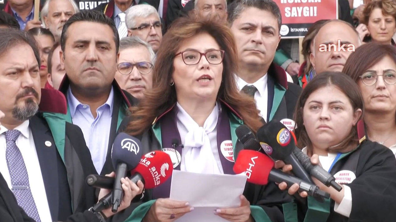 'Hukuk devletine saygı' pankartının açıldığı ve alkışlı protestonun yapıldığı basın açıklamasını avukatlar adına açıklamayı İstanbul Baro Başkanı Filiz Saraç okudu.