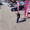 Bu sırada dükkanın önünü temizleyen bir çalışan, dronu görünce önce panikledi.