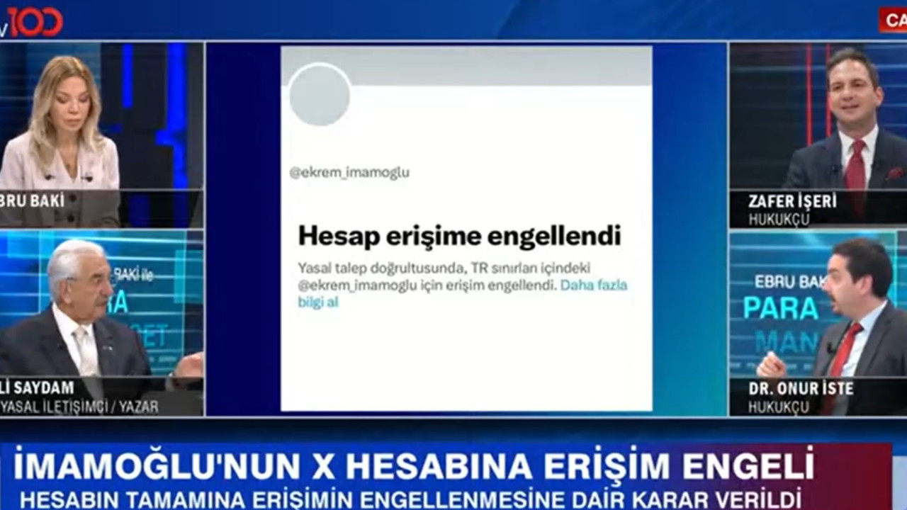 TV100'de canlı yayın konuğu olan Saydam, Cumhurbaşkanlığı Kültür ve Sanat Politikaları Kurulu Üyesi Ali CHP'nin Cumhurbaşkanı adayı Ekrem İmamoğlu'nun X hesabının erişime engellenmesiyle ilgili karar tepki gösterdi.