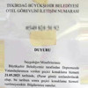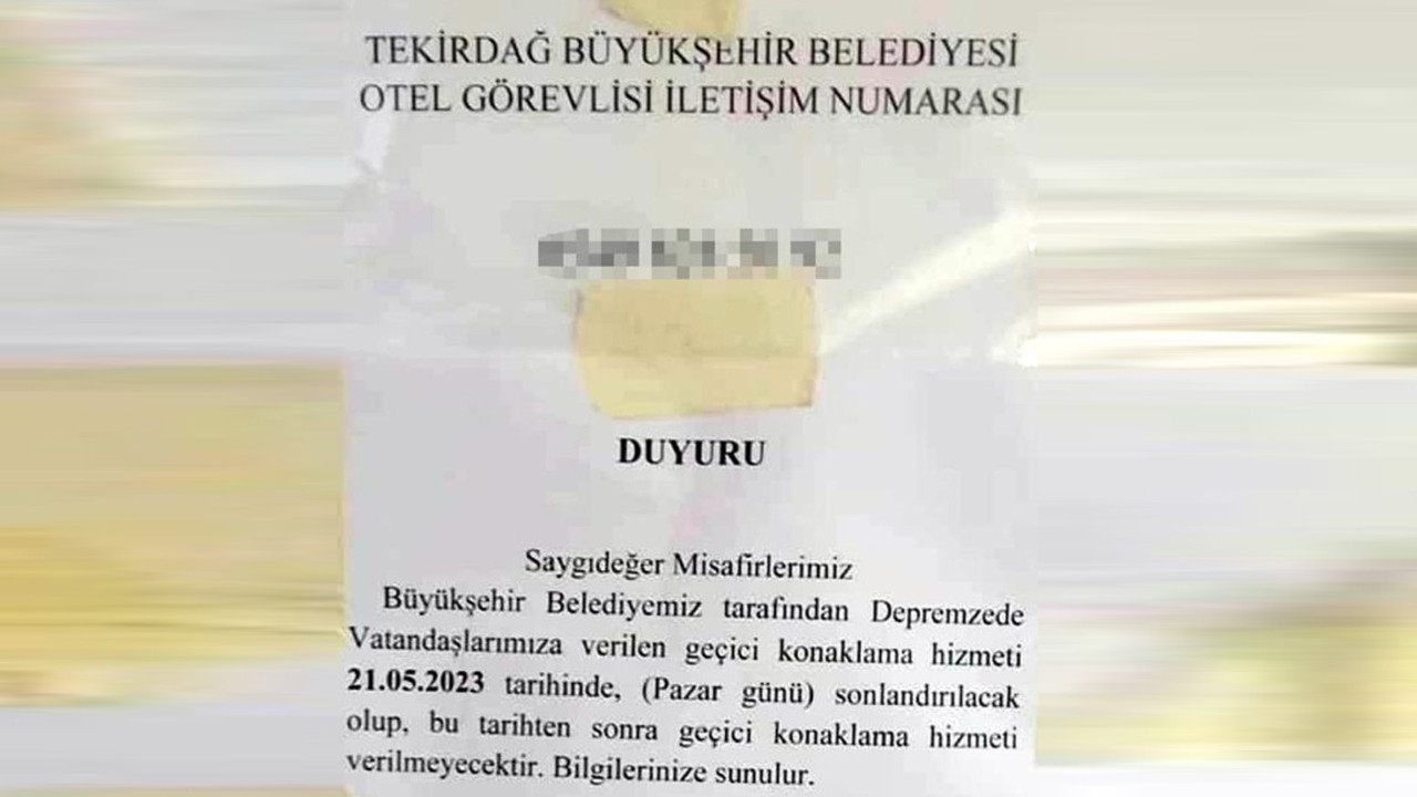 "6 Şubat 2023 tarihinde, Kahramanmaraş merkez üssü olan Gaziantep, Adıyaman, Adana, Hatay, Şanlıurfa, Kilis, Malatya, Osmaniye, Diyarbakır ve Elazığ illerimizde meydana gelen deprem nedeniyle Tekirdağ Büyükşehir Belediyemiz tarafından ilimize gelen ve AFAD tarafından yönlendirilen depremzede vatandaşlarımıza ilimiz Süleymanpaşa ilçesinde kiralanan otellerde, 8 Şubat 2023 tarihinden itibaren geçici konaklanma hizmeti verilmeye başlanmış ve bugüne kadar her türlü ihtiyaçları Büyükşehir Belediyemizce karşılanmıştır. Depremzede vatandaşlarımıza yönelik söz konusu geçici konaklama hizmetimiz 21 Mayıs 2023 tarihinde sonlandırılacak olan AFAD tarafından gerekli işlem yapılması hususunda, gereğini arz, rica ederim. Ayrıca otellere asılan ‘duyuru’ başlıklı yazıda, 'Saygıdeğer misafirlerimiz, Büyükşehir Belediyemiz tarafından depremzede vatandaşlarımıza verilen geçici konaklama hizmeti 21.05.2023 tarihinde (Pazar günü) sonlandırılacak olup, bu tarihten sonra geçici konaklama hizmeti verilmeyecektir. Bilgilerinize sunulur.'"