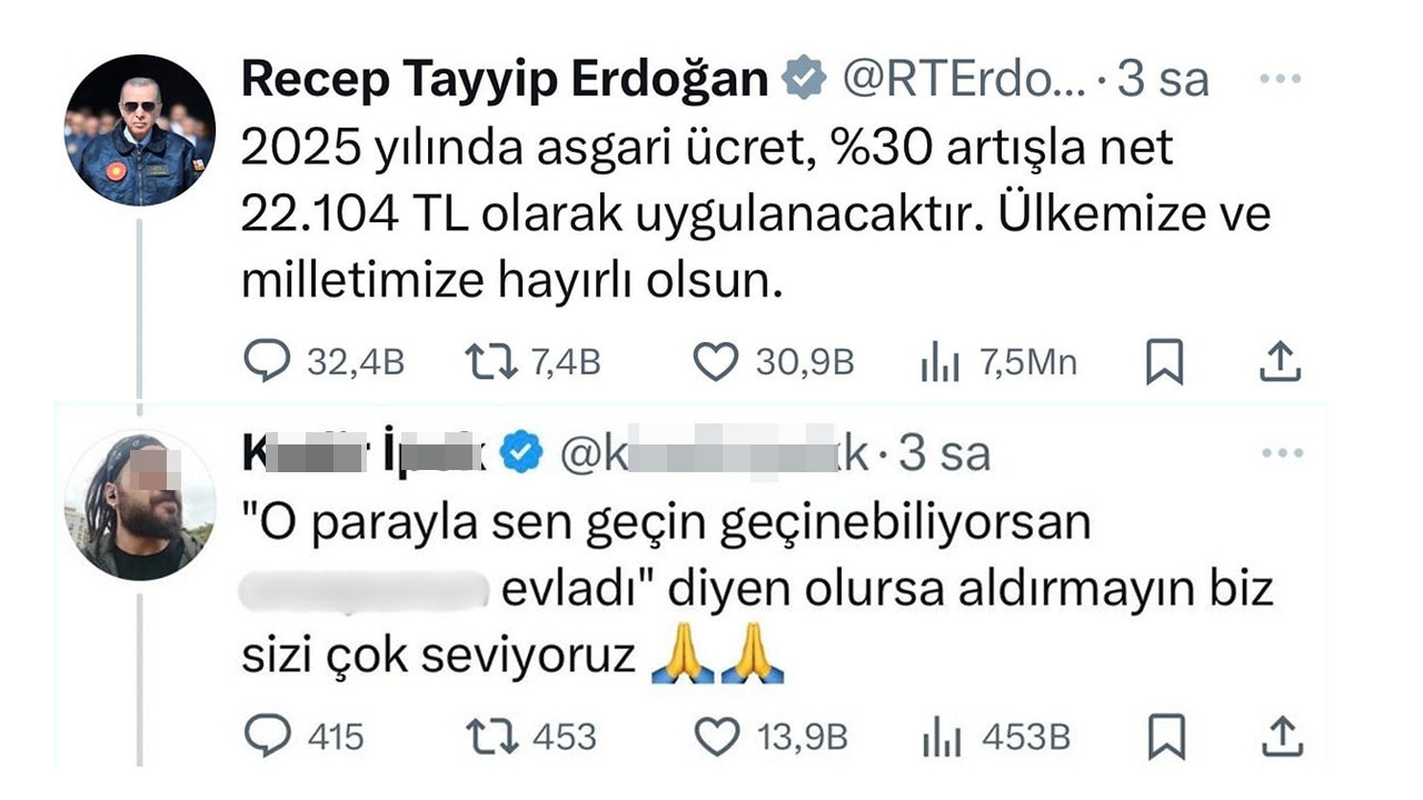 Erdoğan'ın X'te yaptığı "2025 yılında asgari ücret, %30 artışla net 22.104 TL olarak uygulanacaktır. Ülkemize ve milletimize hayırlı olsun" paylaşımının altına binlerce yorum gelirken asgari ücret zammını yeterli bulanlar kadar tepki gösterenler de vardı.