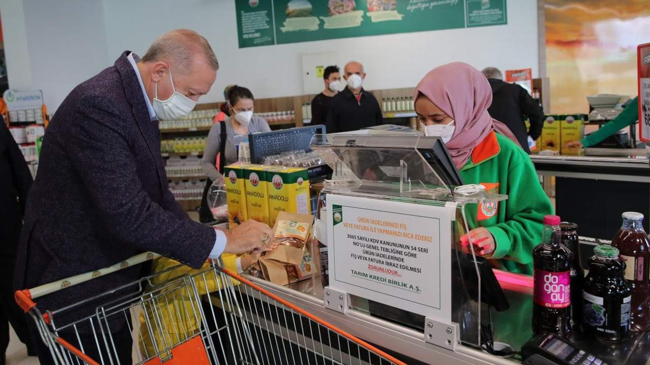 Erdoğan da bu incelemelerin ardından Tarım kredi kooperatiflerine ait bir markete giderek alışveriş yaptı.