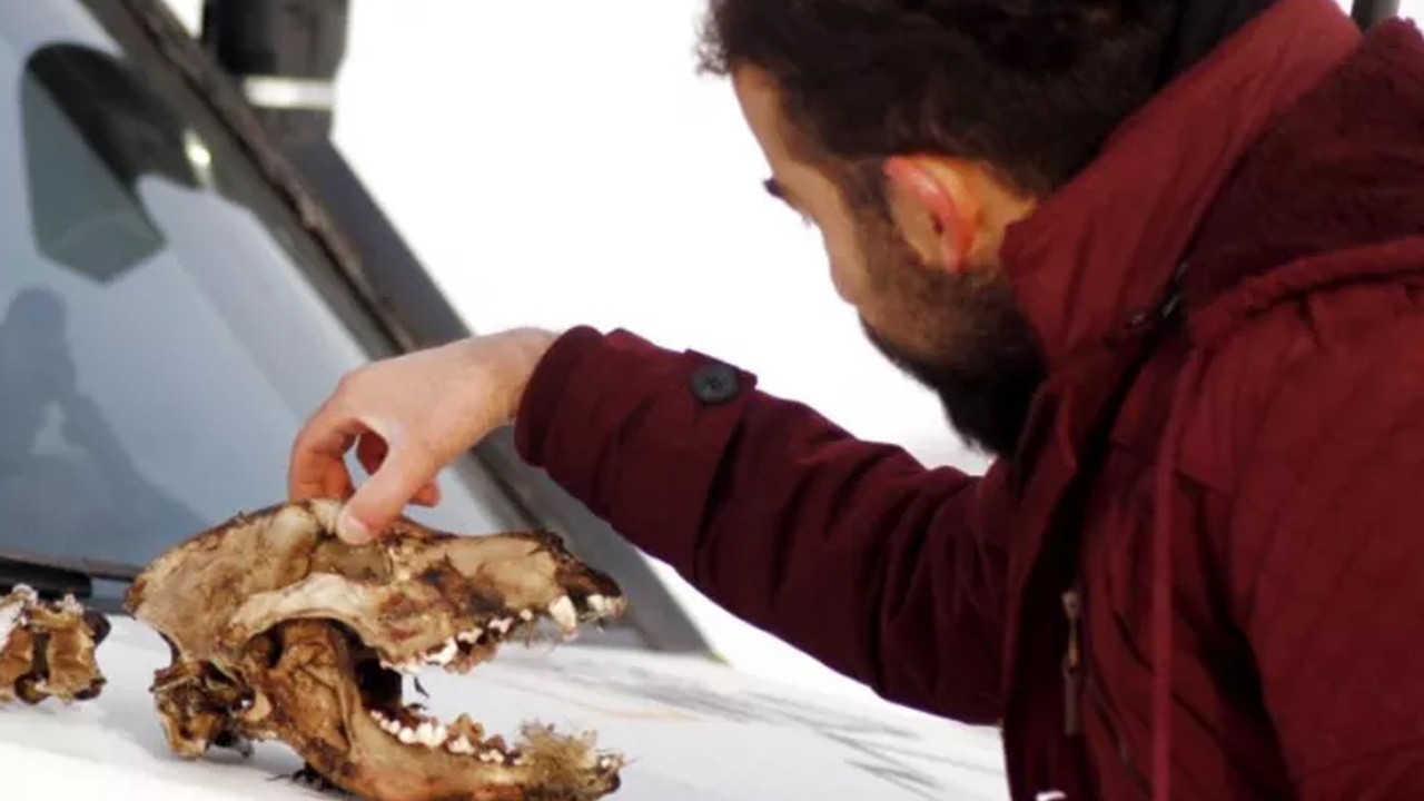 Hakkari'nin Yüksekova ilçesinde gezgin öğretmen olarak bilinen Ümit Bartın, sabah okula giderken kurtlar tarafından parçalanmış köpeğin geriye kalan kafatasıyla karşılaştı.