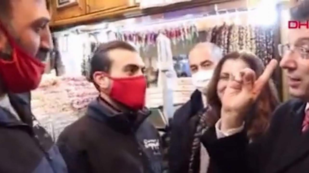 Şekerleme üzerine işletmesi bulunan bir esnaf İmamoğlu’na, “Ben Reis sevdalısı bir kişiyim. PKK’lıları İstanbul Büyükşehir Belediyesi’nde işe mi aldınız, medya da böyle haberler var” diyerek tepki gösterdi. Bunun üzerine İmamoğlu vatandaşa yanıt vermek istedi ancak vatandaş İmamoğlu’nun sözünün kesip kendisini dinlememesi üzerine “Hâlâ dinlemiyorsun. Paşa dinlemiyorsun, böyle olmaz. Aynen seninki gibisin, hiç dinlemiyor. Bak hiç dinlemiyor. seninki de dinlemiyor” dedi. İmamoğlu, konuşmasının devamında, “Türkiye’de bir belediye PKK’lıyı işe alacak da benim devletim nerede, niye gelip tutuklamıyor onu. Senin beynin tutulmuş” cevabını verdi.