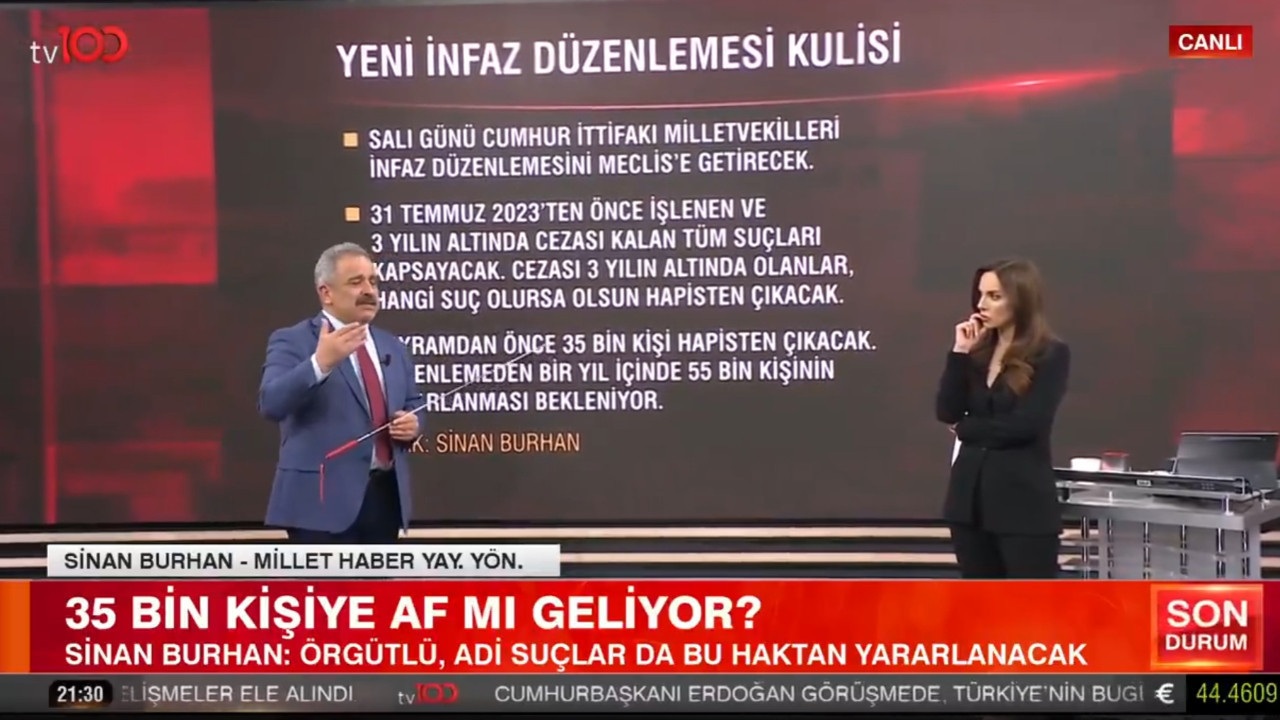 tv100 ekranlarında canlı yayınlanan Gündem Özel adlı programa konuk olan Sinan Burhan, Cumhur İttifakı milletvekillerinin Ceza İnfaz Kanunu'ndaki değişiklik teklifini 27 Mayıs Salı günü TBMM'ye getireceğini duyurdu.