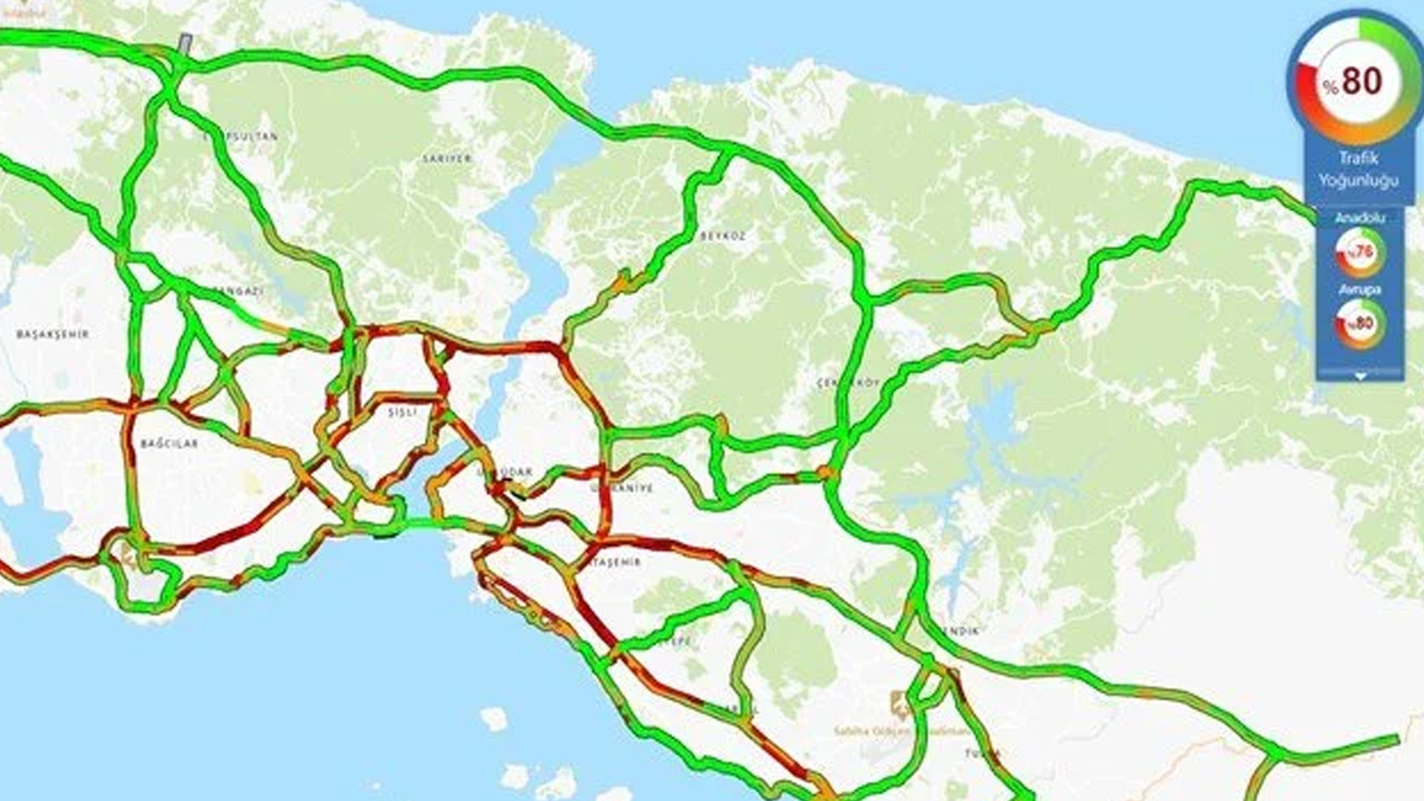 İstanbul Büyükşehir Belediyesi Trafik Yoğunluk Haritası'na göre, Anadolu Yakası'ndaki trafik yoğunluğu mesai saatinin bitimine saatler kala yüzde 76'ya yükselirken Avrupa Yakası'nda ise yüzde 80'e çıktı.