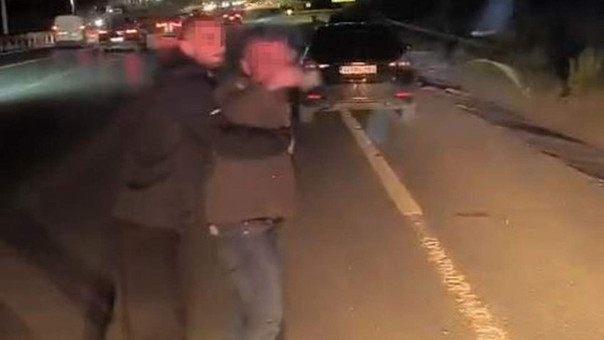 Tartışmanın büyümesiyle otomobildeki 2 kişi otobüsün önünü kesip şoföre tehditler savurarak saldırmaya çalıştı. O anlar otobüs şoförü tarafından anbean kaydedildi.